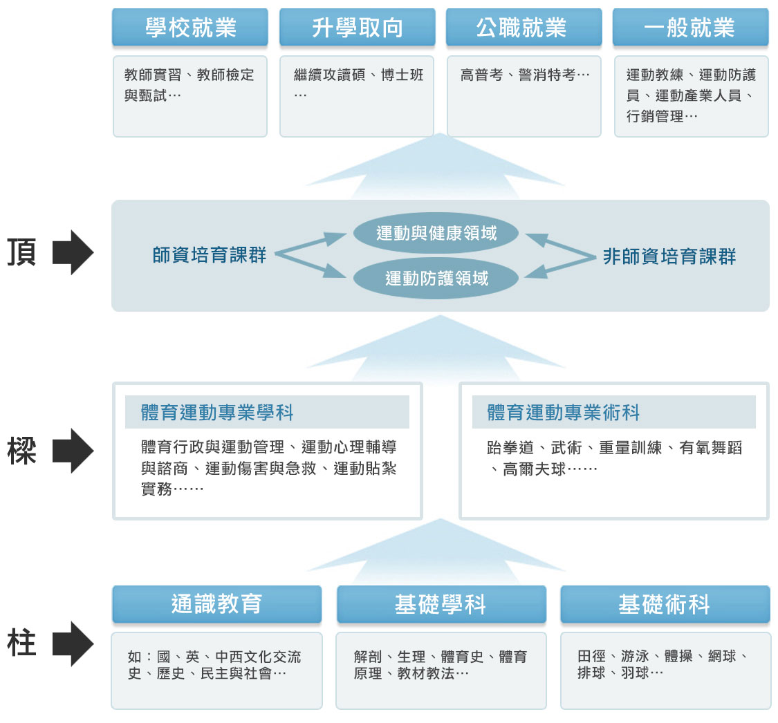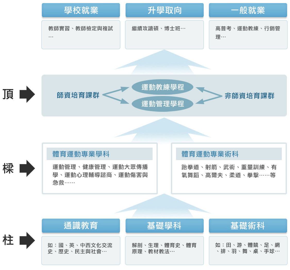 本系課程之設計理念以培育優秀中等學校體育師資、造就具全方位專業知能與服務熱忱之體育運動專業人才,並融入校務發展計畫,順應社會需求之改變,同時注重廣博學識與健全人格之通識課程,以培養為社會國家所用之人才。本系除提供學生優質的學習環境,並以完整之「柱」、「樑」、「頂」之規劃特色(如下圖),培養其具備體育專業知識、技能、體育行政、管理與領導等專業能力外,另著重學生外語及電腦能力的養成,確保其畢業後之就業競爭力。