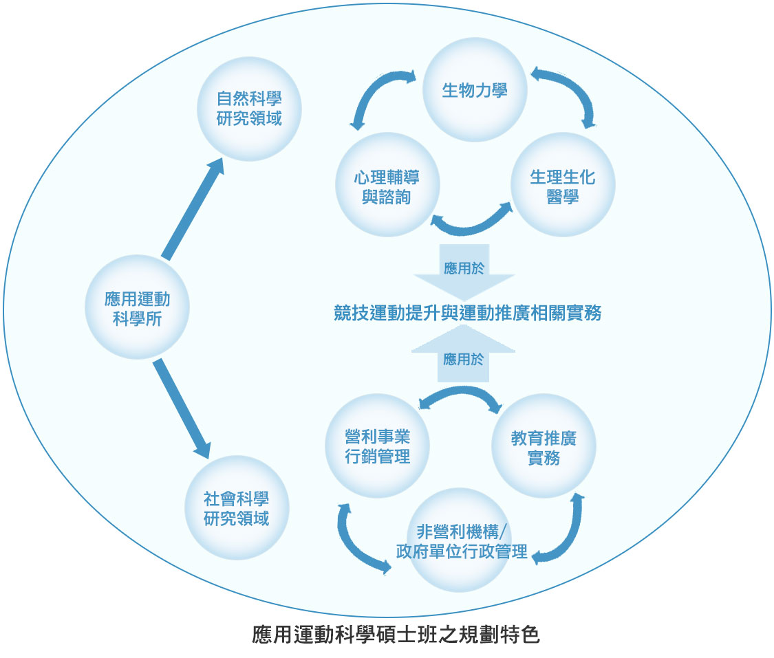 - 不同於其他運動科學研究所偏重於自然科學領域的發展,本碩士班同時規劃社會科學領域之研究,對於營利事業單位之運動行銷管理、政府組織、非營利事業(Non-profit organization, NPO)或非政府組織(Non-governemnt organization, NPO)之運動政策、運動文化、運動哲學、與運動教育推廣等,也納入本所之研究領域與人才培訓的範疇。
