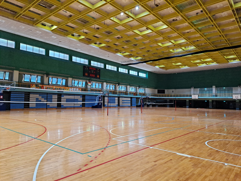 綜合球場為體育館最具規模之運動場地,淨高達12公尺,內部規劃有三面籃球、排球及手球兼用場地,地面鋪設具吸震功能之浮式枕木楓木地板,彈性佳,可有效避免運動員發生運動傷害。牆面安裝具吸音效果之木絲水泥板,能有效減少噪音產生。球場南北兩側設有1,200張座位之伸縮看台座椅,可提供作為符合國際標準之手球比賽場地;球場上方並設有人工跑道,可供雨天體育教學及運動代表隊訓練使用。