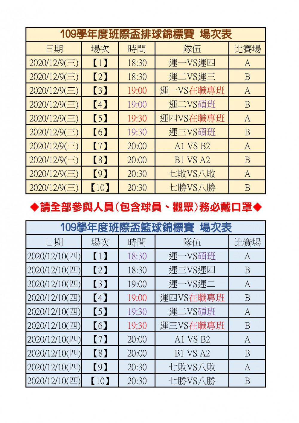 【賽程公告】109學年度班際盃排球(12/9)、籃球(12/10)錦標賽場次表。請全部參與人員(包含球員、觀眾)務必戴口罩。
