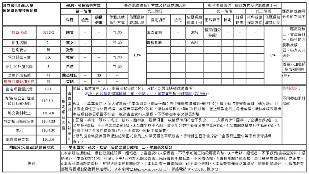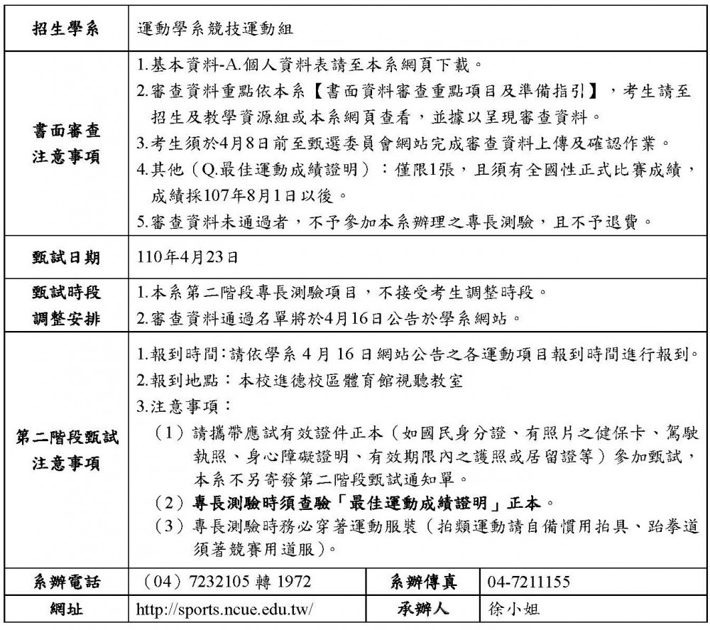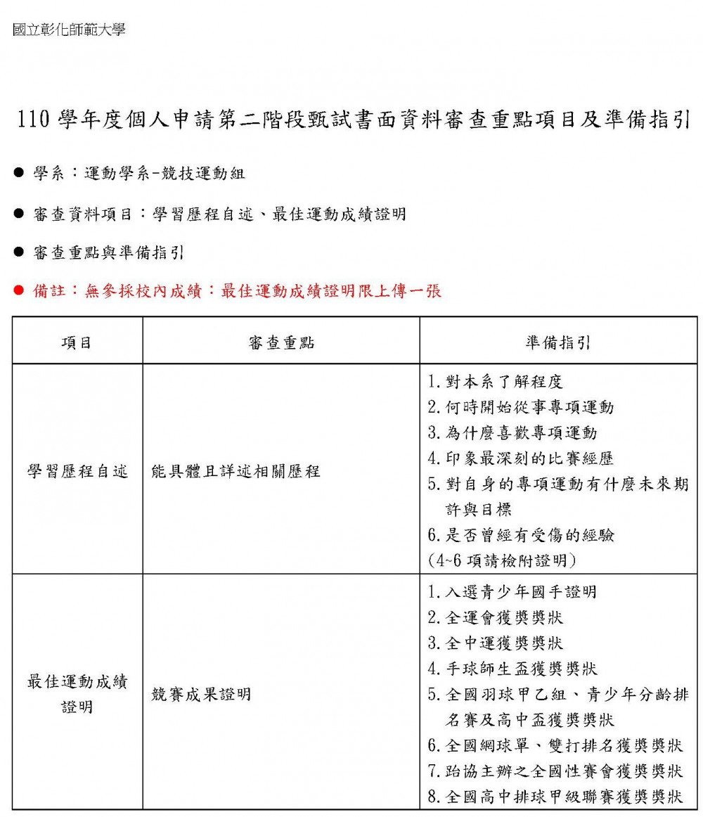 公告本系110學年度個人申請【競技運動組】相關資訊
