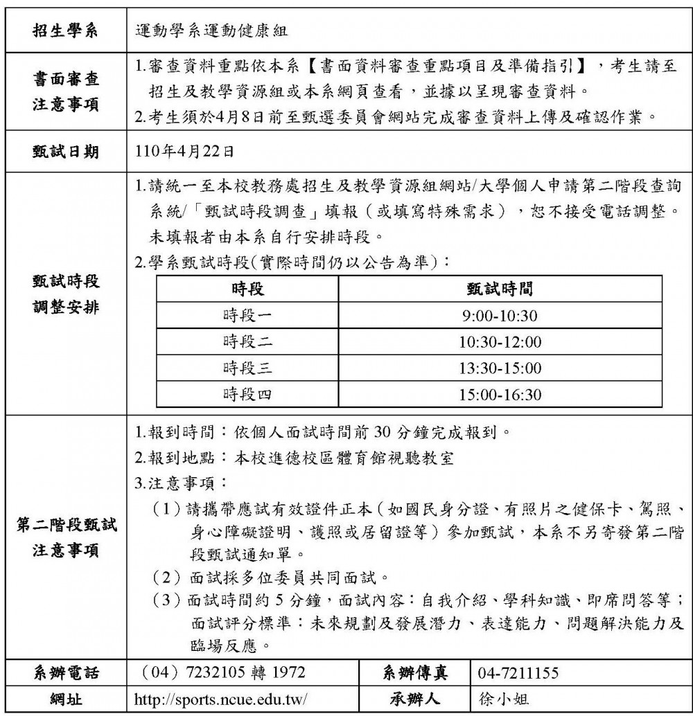 公告本系110學年度個人申請【運動健康組】相關資訊