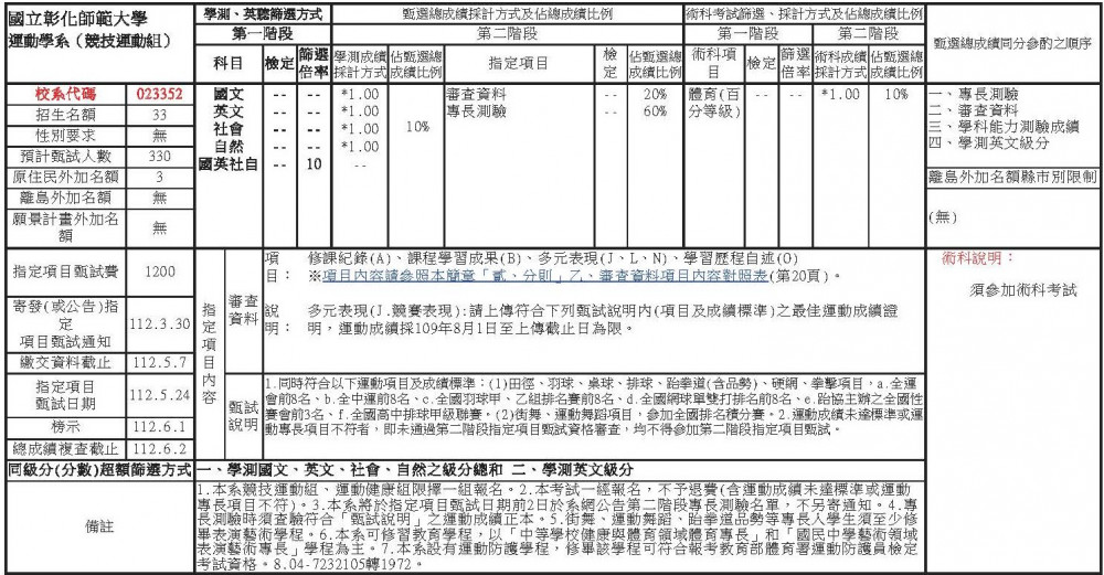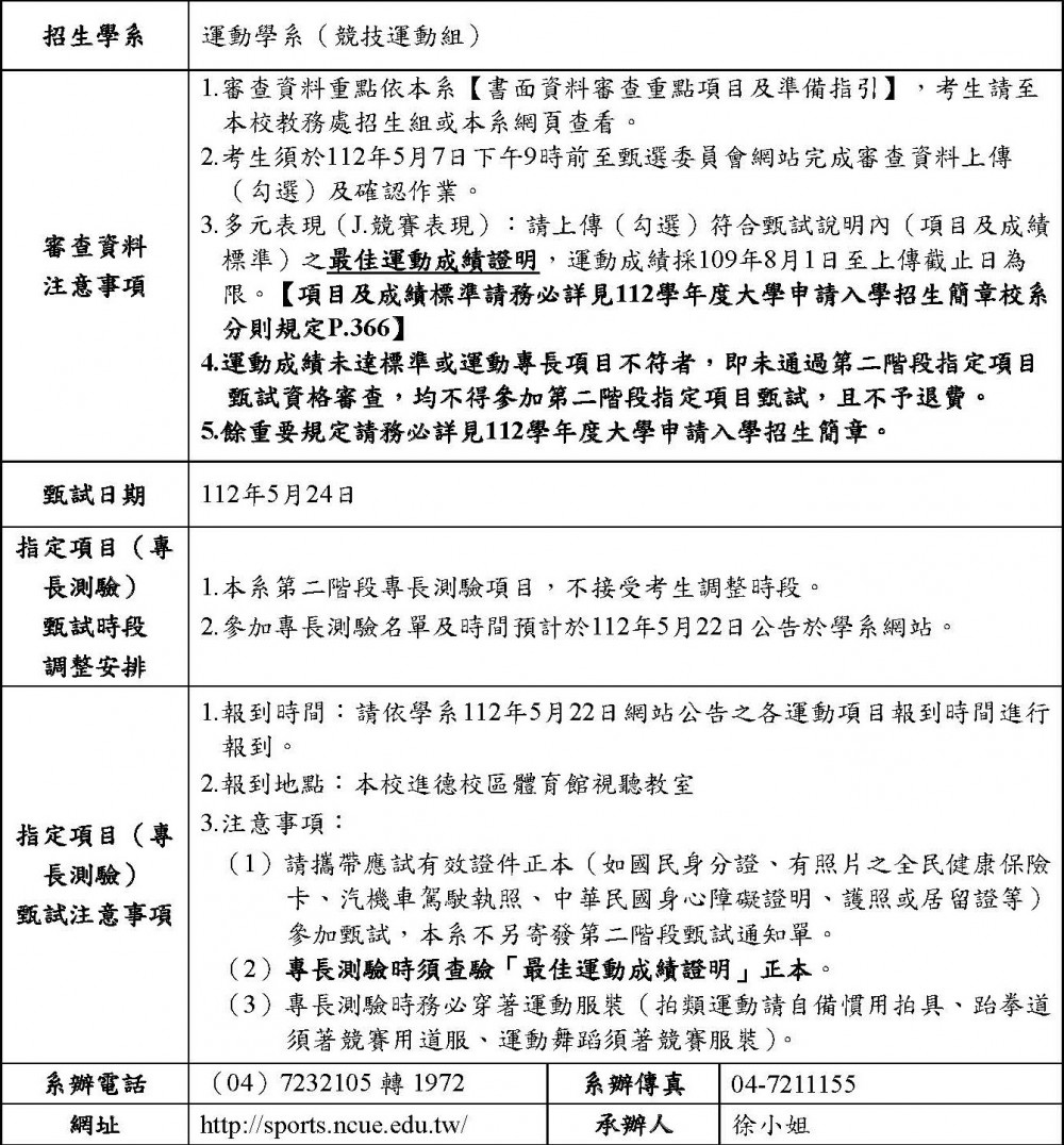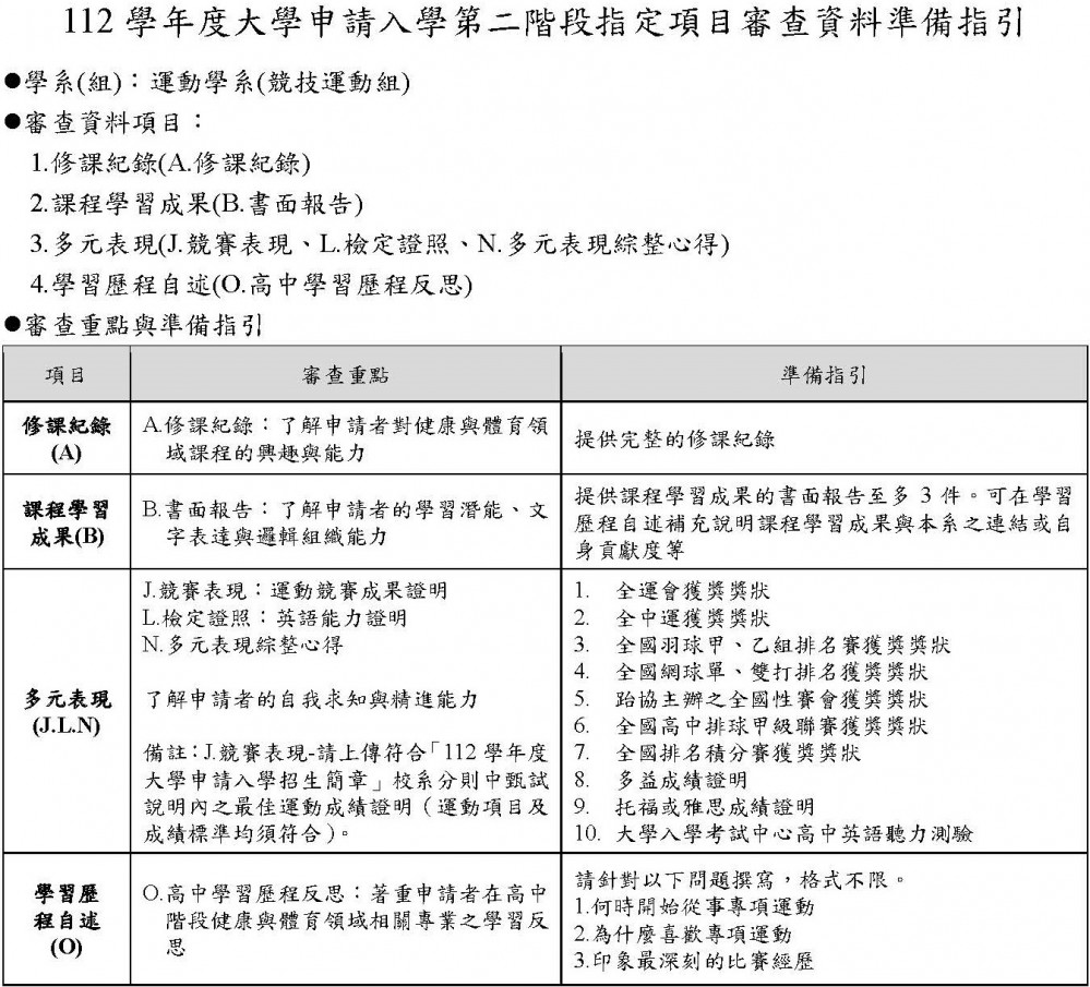 公告本系112學年度大學申請入學【競技運動組】招生資訊及審查資料準備指引