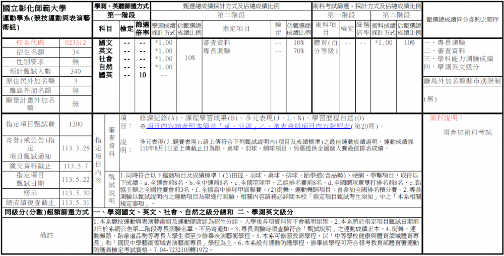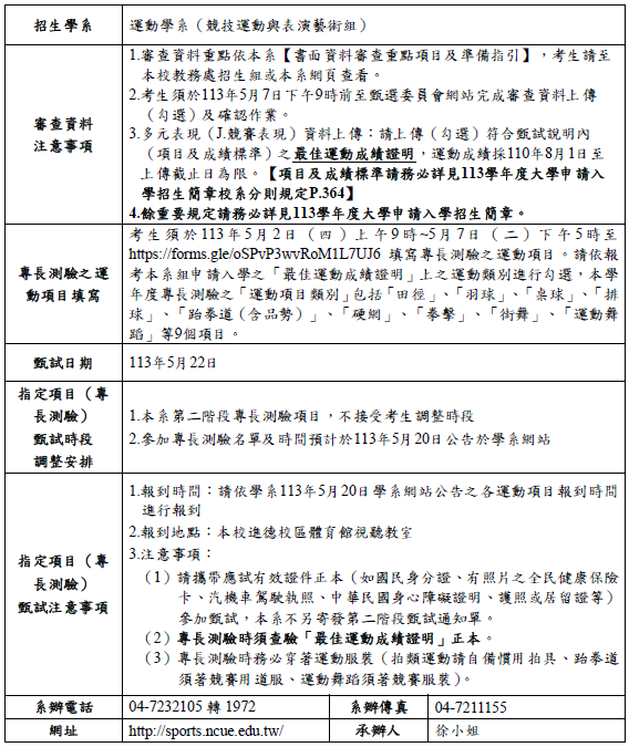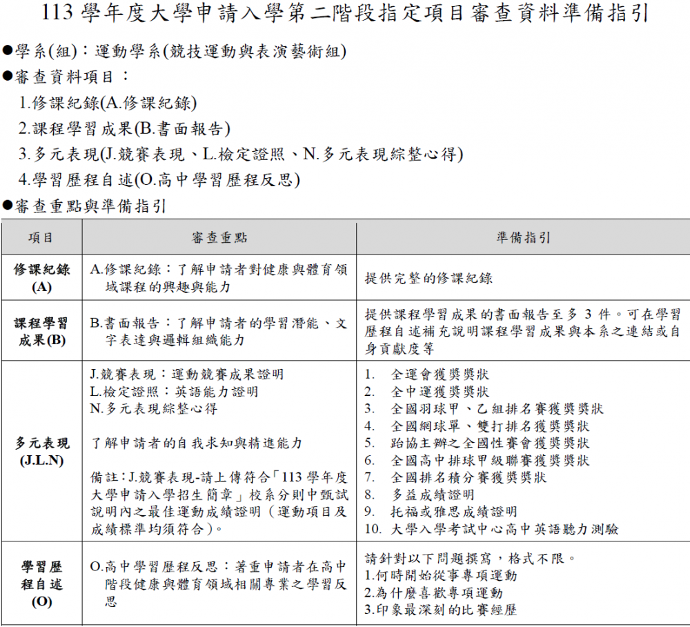 公告本系113學年度大學申請入學【競技運動與表演藝術組】招生資訊.審查資料準備指引及第二階段甄試考生須知