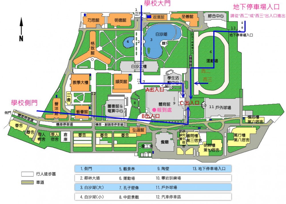 六、學校運動場下方B1收費停車場每小時30元,請多加利用。請從【西二】或【西三】出口進出。本校採車牌辨識系統,請離場前務必至繳費機繳完停車費始可離場。