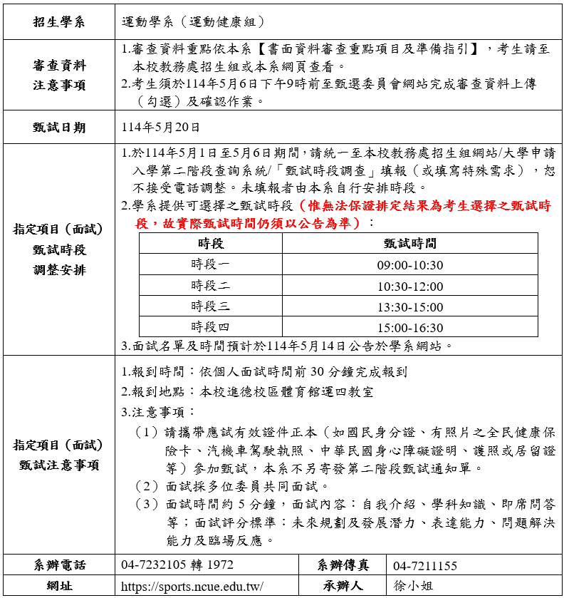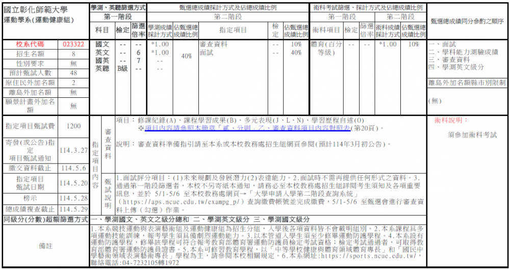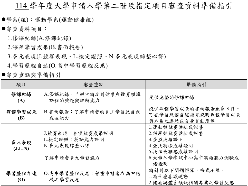公告本系114學年度大學申請入學【運動健康組】招生資訊.審查資料準備指引及第二階段甄試考生須知