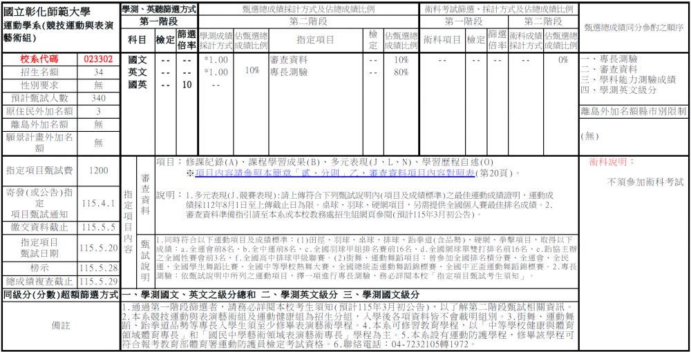 公告本系115學年度大學申請入學【競技運動與表演藝術組】校系分則