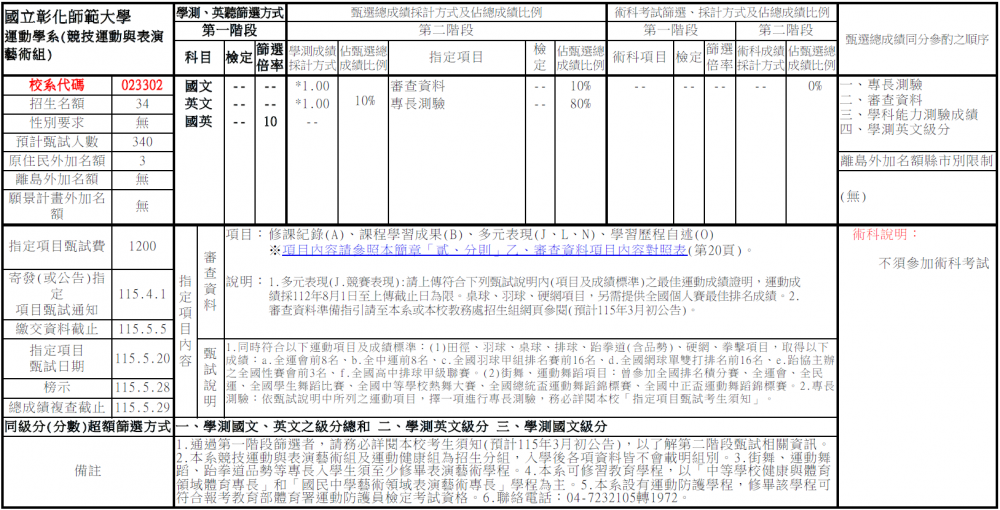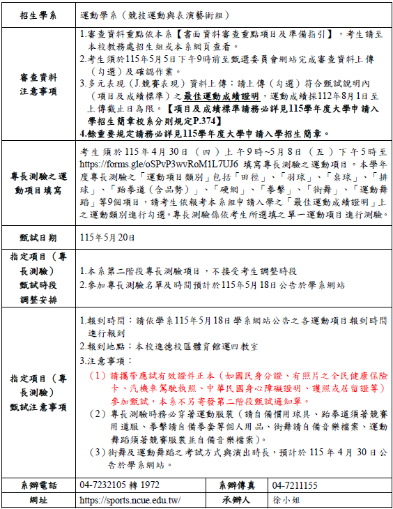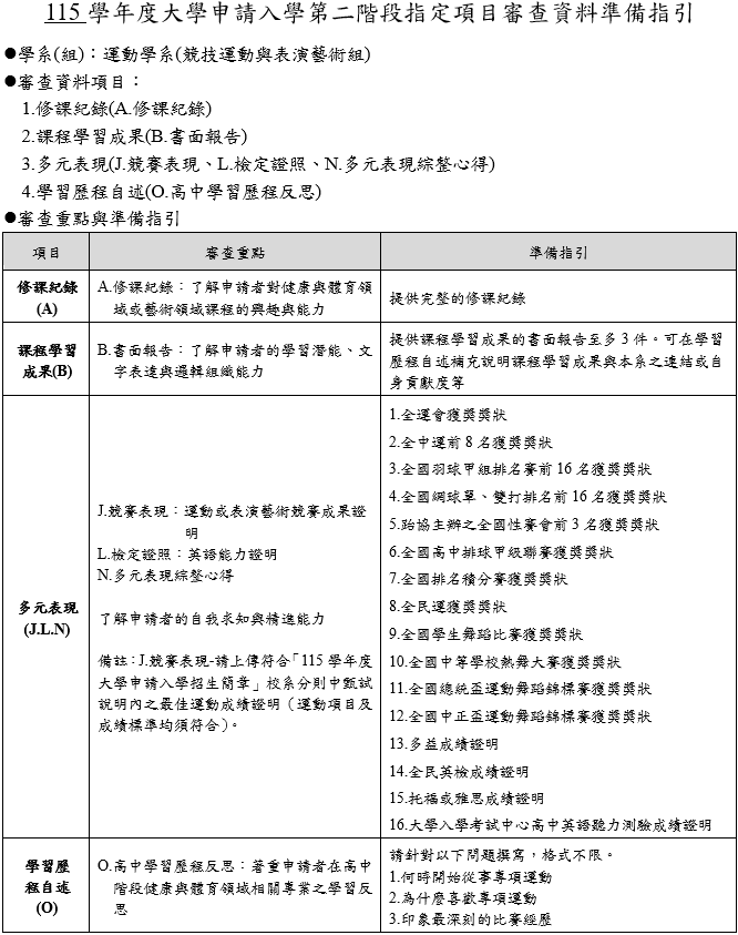 公告本系115學年度大學申請入學【競技運動與表演藝術組】招生資訊.審查資料準備指引及第二階段甄試考生須知